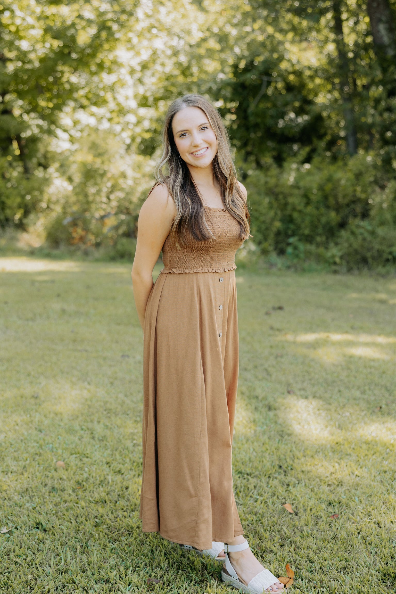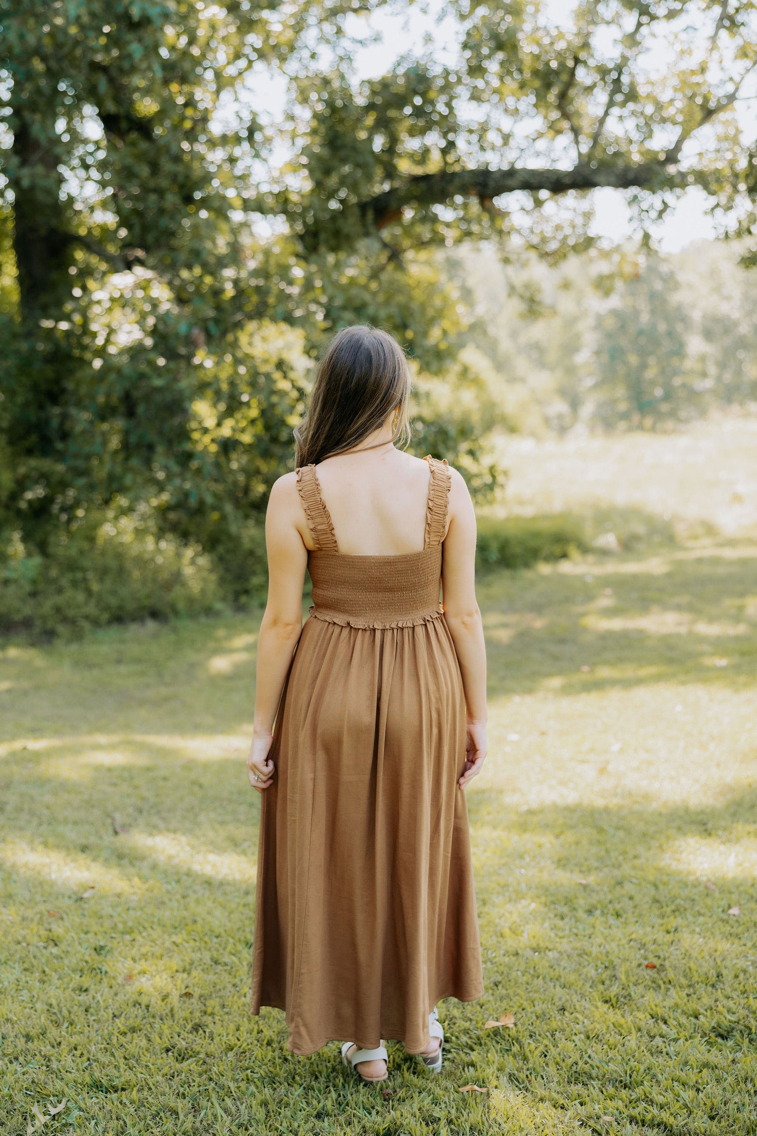 Our Camel Front Button Dress is the perfect Fall Color with so much detail