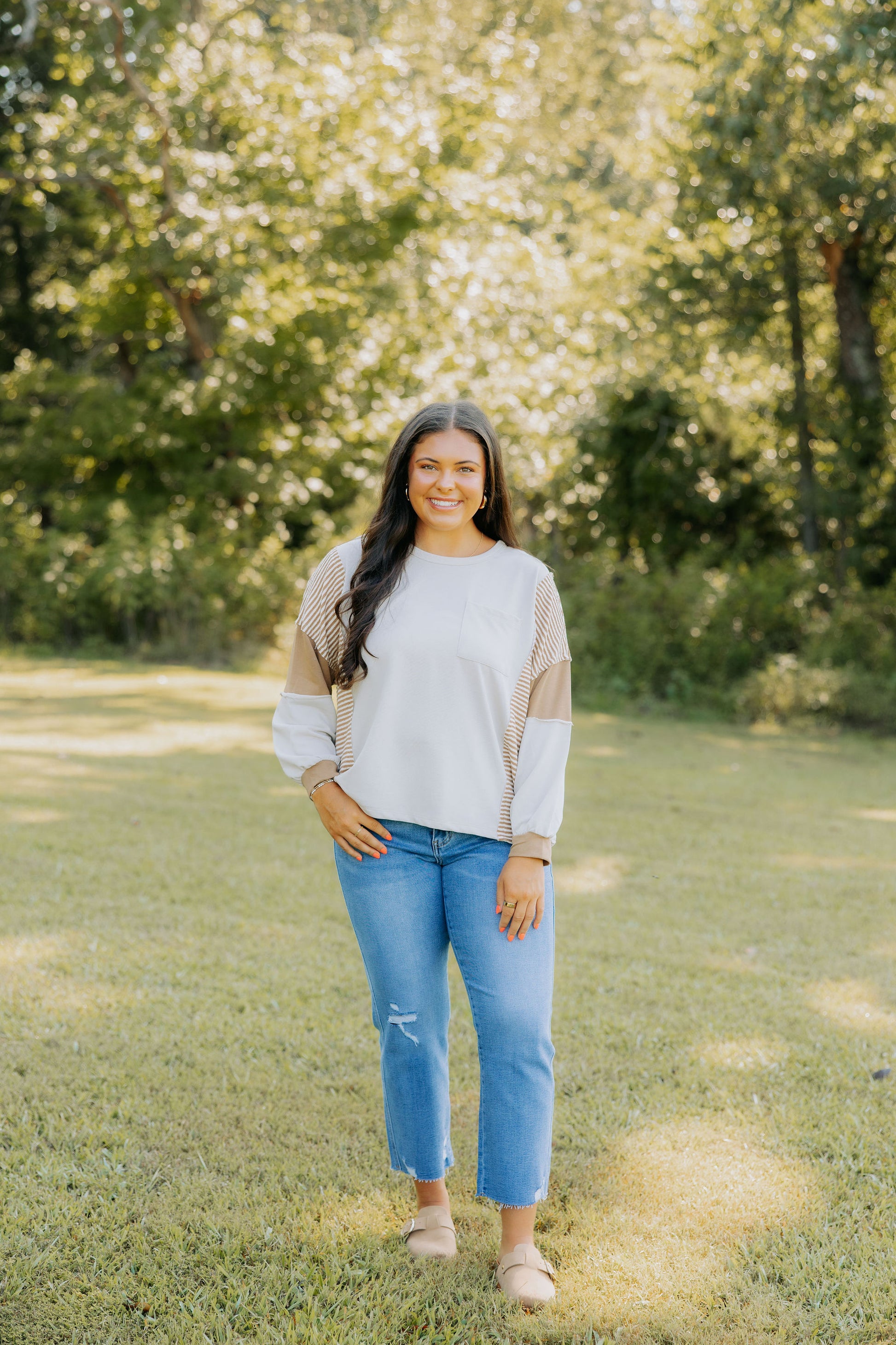 The perfect top for Fall has just arrived! Light weight, comfy and just the right amount of detail. Bre is pictured in the medium, top has a loose, relaxed fit.